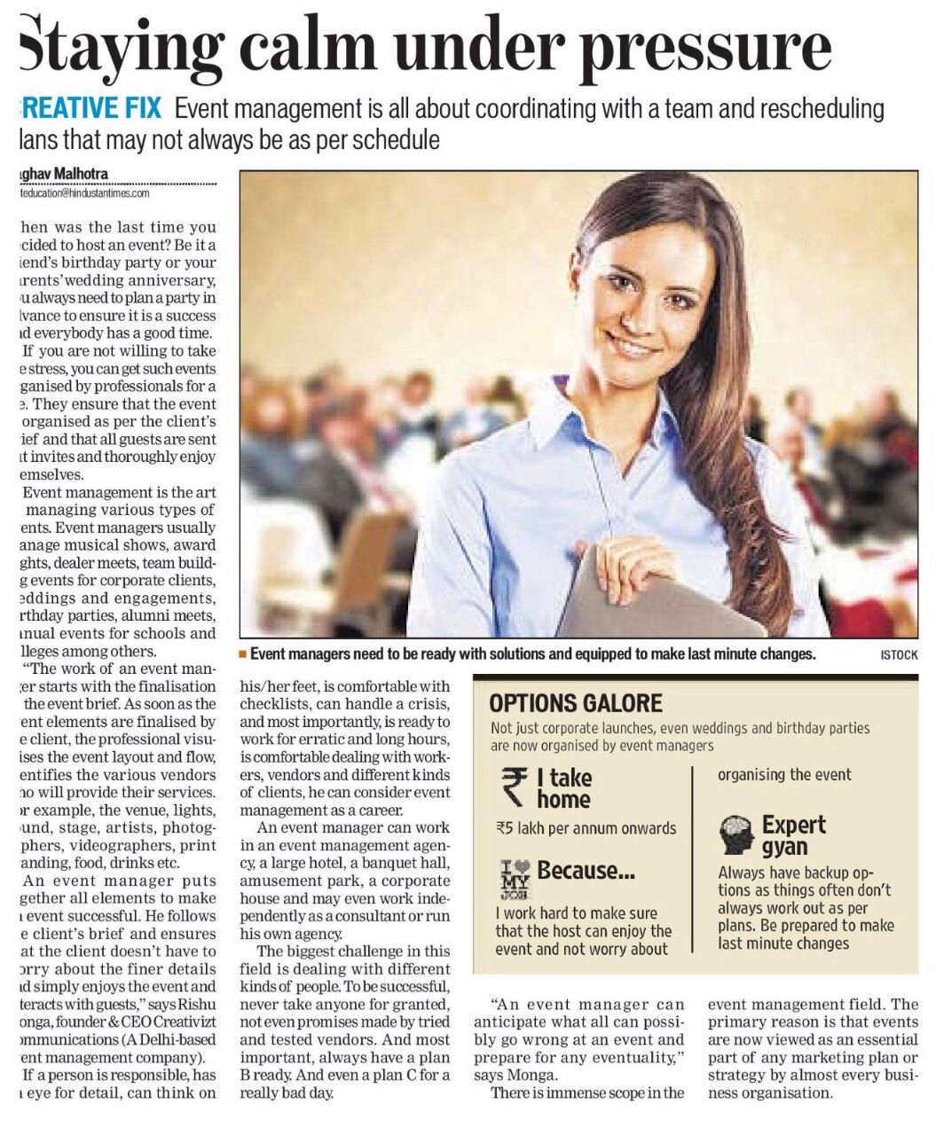 Our Founder & CEO, Rishu Monga, is an accomplished event management specialist, and he leads from the front. He is regularly quoted by the mainline media on a variety of subjects including event management in Gurgaon and the latest in the series has been the story by India's leading English newspaper, the Hindustan Times (HT Online Story and HT Scanned Copy) on his take on professional event management as a viable career option.