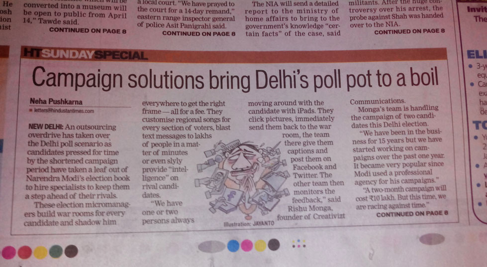 Recently featured by Hindustan Times on its first page for political pr campaigning during the 2015 Delhi Elections, Creativizt Communications, the Best Political PR Agency in Delhi, has reinforced its position amongst Top Political PR Agencies in India through its extremely successful political pr campaigns including social media promotions on platforms like Facebook, Twitter and Linkedin for candidates from several different political parties.